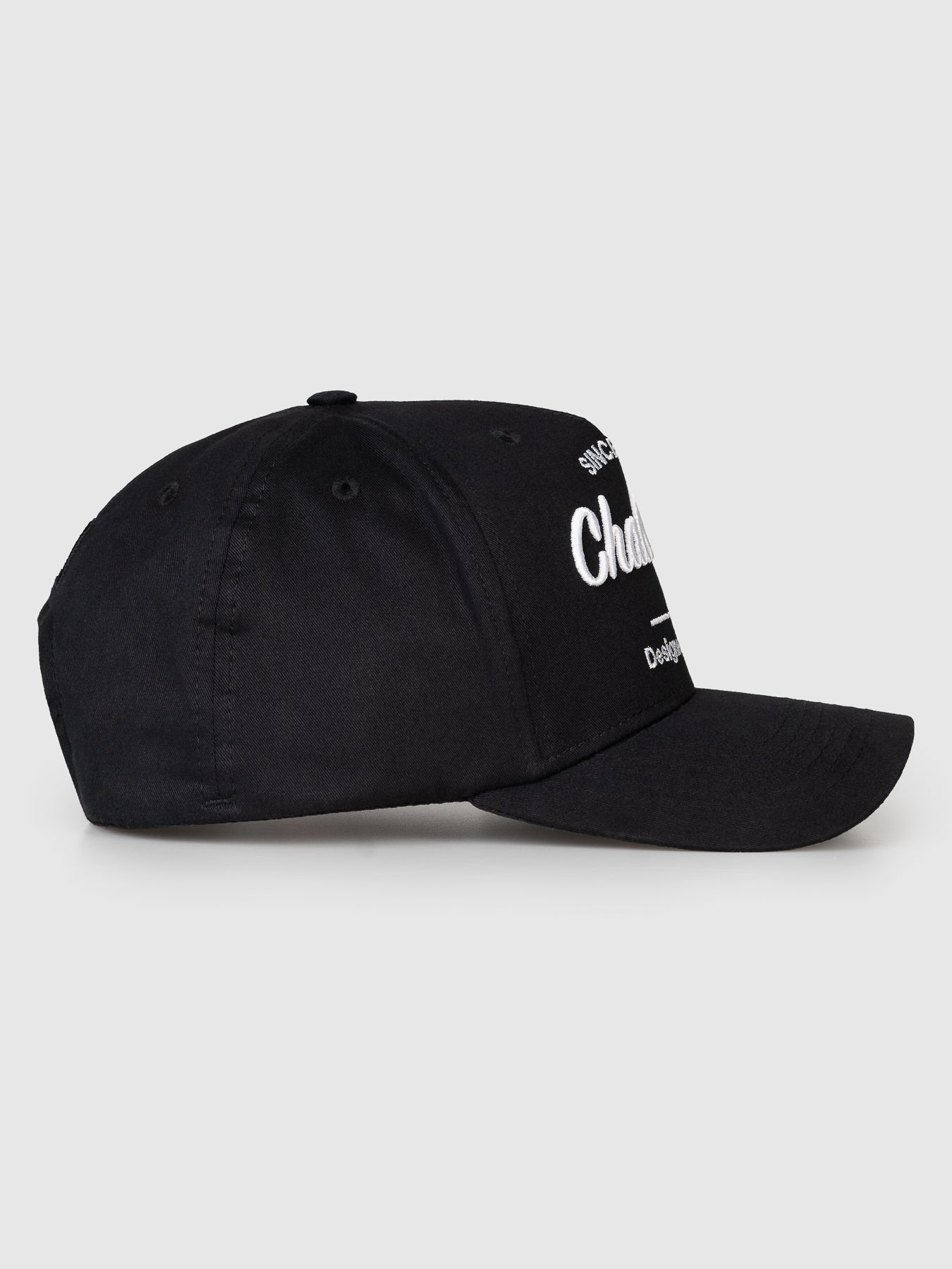 Logo emborrachada sobreposta ao boné com acabamento premium.